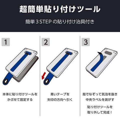 ●端末に被せて、テープを引くだけでフィルムを正確な位置に貼れる超簡単貼り付けツール付きです。