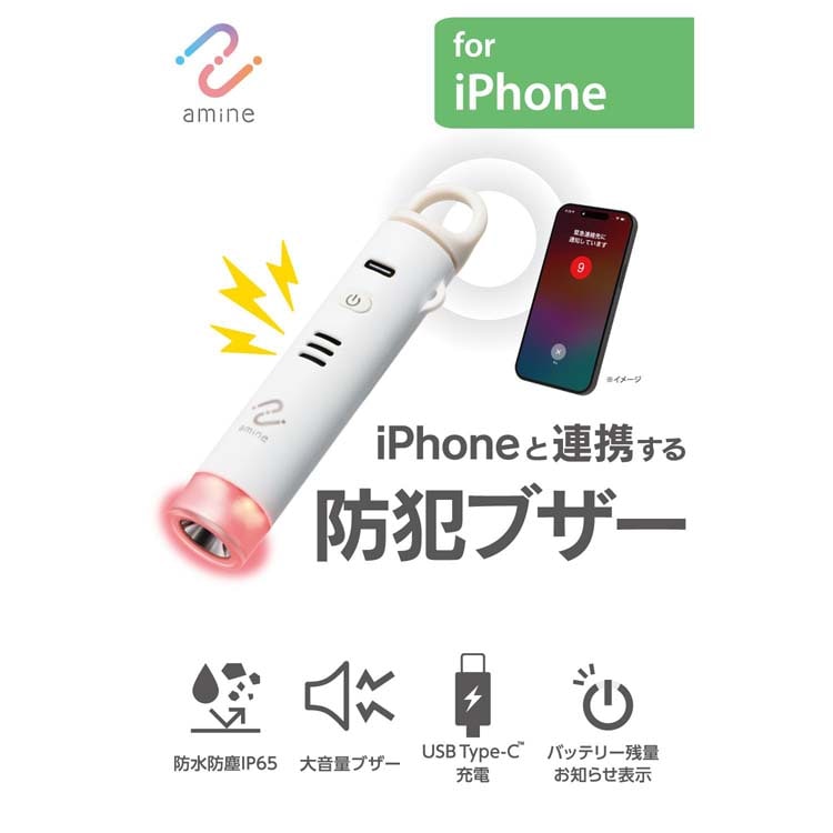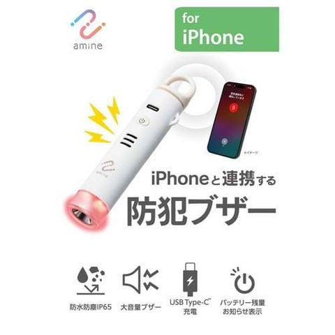 ●防犯ブザー・iPhone連携の緊急通報・LEDライト・忘れ物防止タグ機能の4つの機能を搭載した、多機能セキュリティアイテムです。