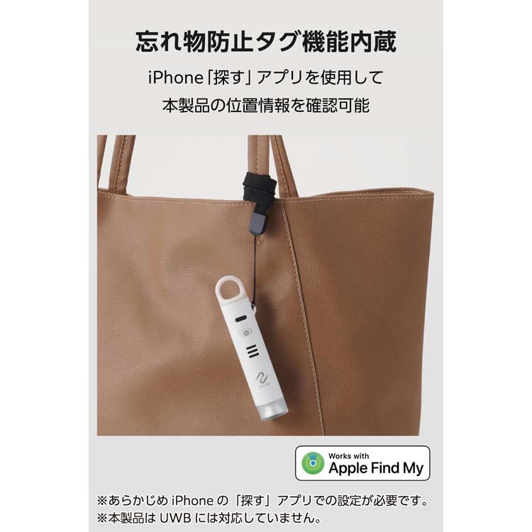 | ・サイズ:幅約22mm×奥行約22mm×高さ約115mm ・重量:約35g ・カラー:ナチュラルホワイト ・対応機種(iPhone):iPhone 7以降のモデル ・対応OS(iOS):iOS 18/17/16 ・対応OS 備考:最新情報は製品ホームページをご確認ください。 ・専用アプリ名:Apple 「探す」アプリ ・防塵・防水性能(保護等級):IP65 ・電池種類:リチウムイオンバッテリー ・充電端子:USB Type-C(TM) ・電池寿命:1回の満充電で約6カ月 ※防犯ブザー、LEDライトなどの使用時間、使用環境によって異なります。 ※ご使用頻度が少なくても、3カ月を目安に定期的に充電してください。 ・音量:近接:100dB以上、1m:85dB以上 ・LED:4モードLEDライト:(1)白色LED点灯、(2)白色LED点滅、(3)赤色LED点滅、(4)緑色ほたる点滅 ・状態表示LED:充電中:赤色点灯、充電完了:緑色点灯、バッテリー残少:赤色点滅 ・使用環境温度:0度~40度 ・使用環境湿度:20%~80%RH ・保管環境温度:0度~40度 ・保管環境湿度:10%~90%RH ・保証期間:ご購入日より1年間 ※保証期間は製品に対する保証期間であり、電池寿命に対する保証ではありません。 |
