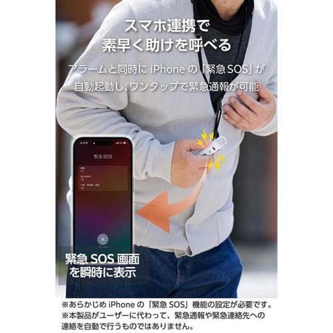 ●アラーム音と同時に、Bluetooth(R)でペアリングしたiPhoneの「緊急SOS」機能が自動で起動。警察(110番)、消防(119番)、海上保安庁(118番)への緊急通報がワンタップで可能です。万が一の時も、音・光・スマホ連携で素早く助けを呼べる、心強い防犯サポートです。