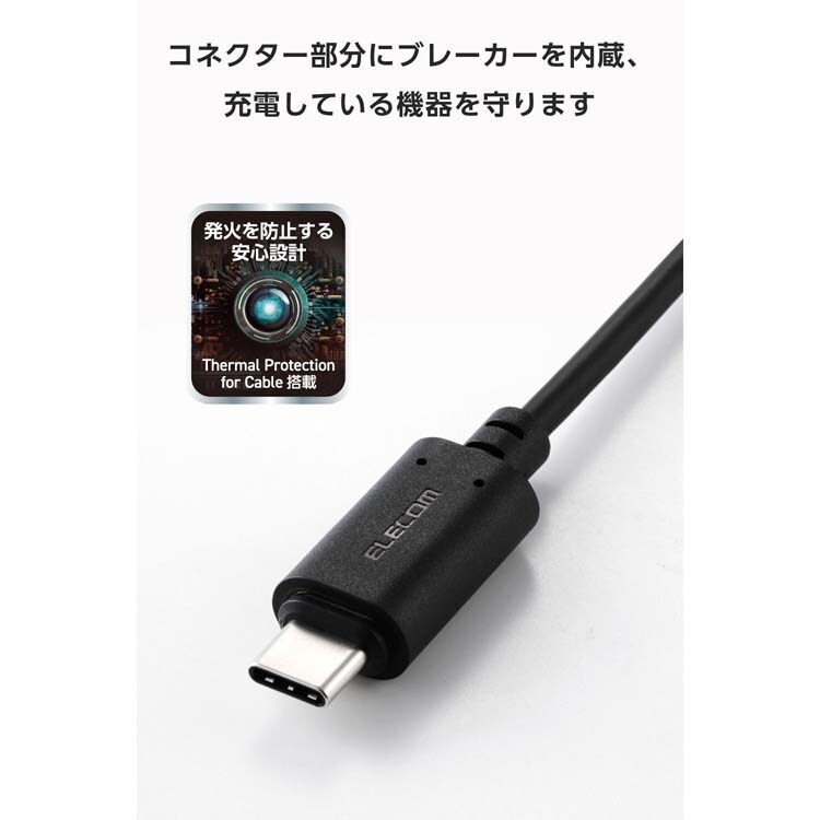 ●Thermal Protection for Cableを搭載。コネクター部分にブレーカーを内蔵し、高温状態や過電流を検知して電流を遮断します。異物の挟み込みや水滴がついた状態などの意図しない接続によるショートや発熱・発火から機器を守り、常温・正常な状態に戻れば引き続き使用できます。
