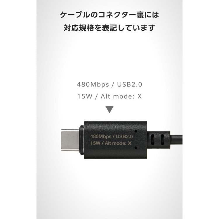 | ・コネクター形状:USB-Aプラグ - USB Type-C(TM)プラグ ・対応機種:USB-Aポート搭載のAC充電器・モバイルバッテリー・パソコンおよび、USB Type-Cポート搭載のスマートフォン・タブレットなど ・通信規格:Hi-Speed USB(USB2.0) ・対応転送速度:最大480Mbps ※理論値 ・USB Power Delivery対応:無 ・対応電圧/電流:最大5V/3A(15W) ・DisplayPort Alternate Mode対応:無 ・プラグメッキ仕様:金メッキピン ・ツイストペアケーブル(通信線):有 ・ケーブル長:約1m ※コネクター含まず ・ケーブル太さ:約3.5mm ・カラー:ブラック ・パッケージ形態:紙箱 ・保証期間:1年間 ・環境配慮事項:EU RoHS指令適合(10物質)、THINK ECOLOGYマーク |