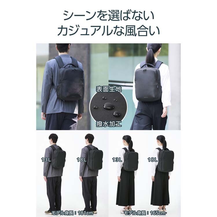 ポケット(気室内):前気室:オープンポケット×3、メイン気室:パソコン用オープンポケット(起毛)×1・オープンポケット(ストレッチメッシュ)×4