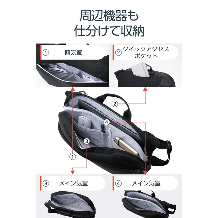 ●メイン気室には、マウスや充電器・ペンなどをすっきり収納できる小分けポケットを配置。アイテムごとに分けて収納できるので、バッグの中が散らかりにくく整理しやすいです。