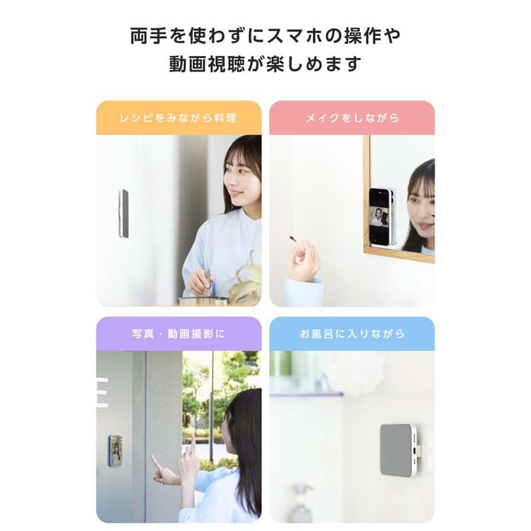 ●壁や鏡、窓ガラスなどの平らな面にシリコン吸盤で簡単に吸着可能。スマートフォンを自由な向きで固定できます。