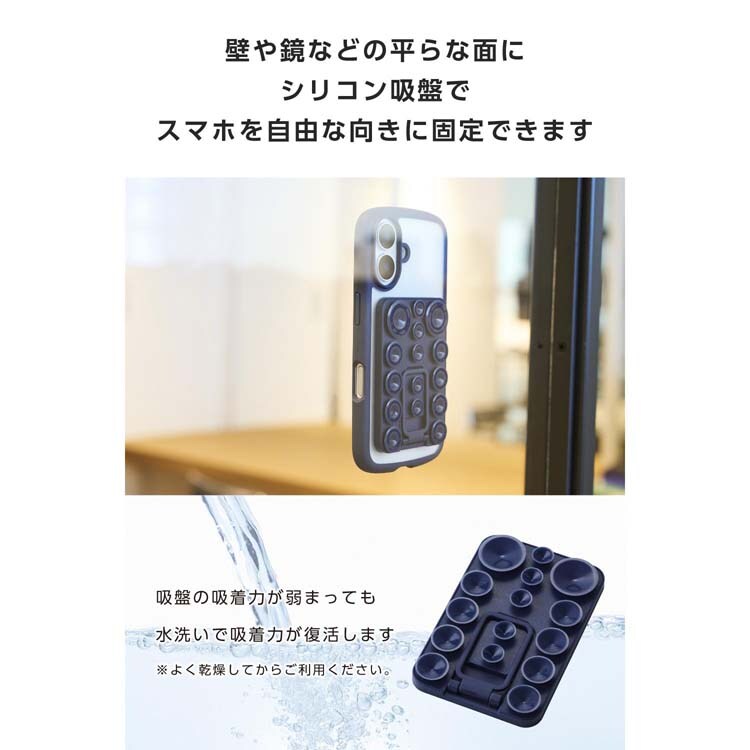 ●壁や鏡、窓ガラスなどの平らな面にシリコン吸盤で簡単に吸着可能。スマートフォンを自由な向きで固定できます。