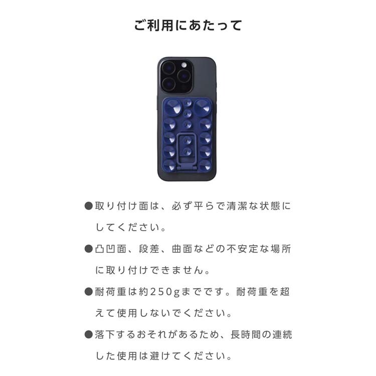 | 対応機種:MagSafe対応iPhone ※MagSafe非対応の機器本体やケースには使用できません。 材質:シリコン、磁石、スチール、亜鉛合金 外形寸法:W約60mm×D約9.4mm×H約90mm 耐荷重:約250gまで ※耐荷重を超えて使用しないでください。 カラー:ネイビー |