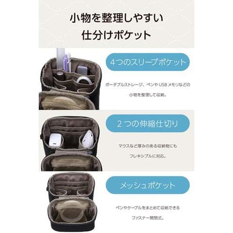 ●ポータブルストレージ、ぺンやUSBメモリなどの小物を整理して収納できる4つのスリーブポケットを備えています。