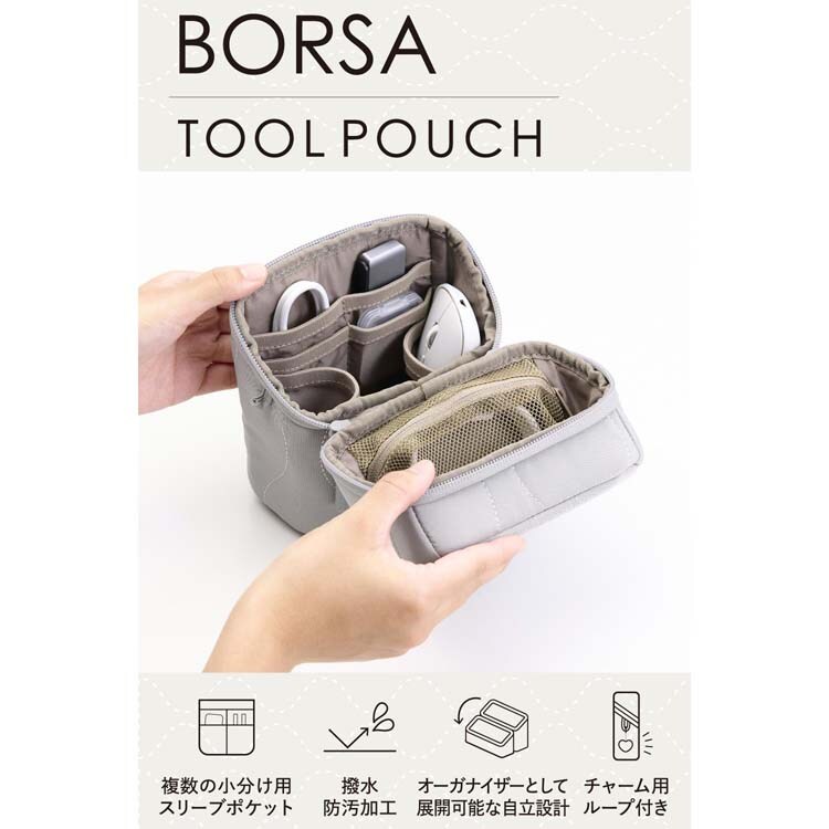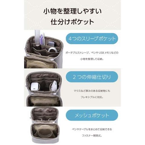 ●ポータブルストレージ、ぺンやUSBメモリなどの小物を整理して収納できる4つのスリーブポケットを備えています。
