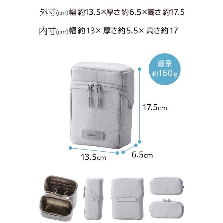 | ・外形寸法:幅約135mm×厚さ約65mm×高さ約175mm ・内寸:幅約130mm×厚さ約55mm×高さ約170mm ・重量:約160g ・材質:ポリエステル ・ポケット(気室内):スリーブポケット×4、伸縮仕切り×2、ファスナーメッシュポケット×1 ・カラー:グレー ・その他:撥水防汚加工(表生地) |