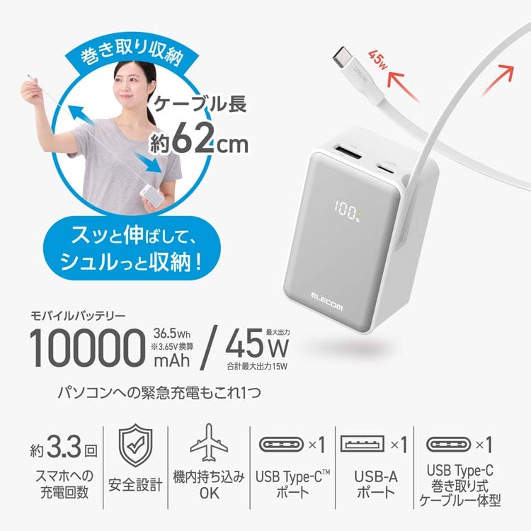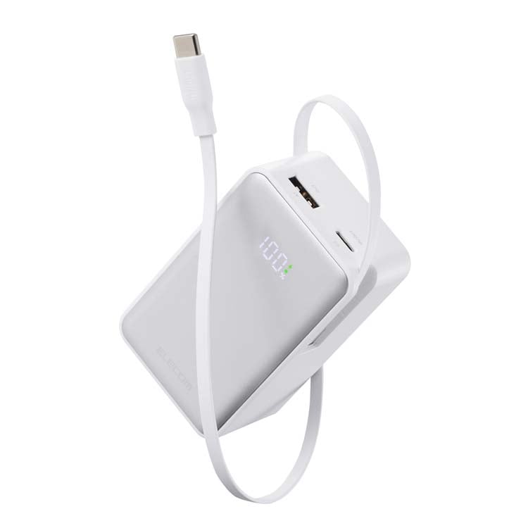 エレコム 巻取り式USB-Cケーブル一体型 モバイルバッテリー 10000mAh 45W ホワイト (1個)