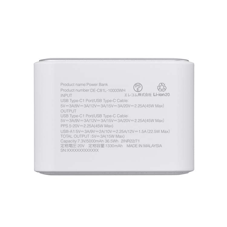 | ・対応機種:iPhoneおよびUSB端子で充電するスマートフォン、タブレット、パソコン、他小型電子機器 ・コネクター形状(電源入力側):USB Type-C(TM)ポート×1、本体一体型USB Type-Cケーブル×1 ・定格入力電圧:5V/9V/12V/15V/20V ・定格入力電流:3A/3A/3A/3A/2.25A(最大45W) ・コネクター形状(電源出力側):USB Type-Cポート×1、USB-Aポート×1、本体一体型USB Type-Cケーブル×1 ・出力:USB Type-C1ポート/本体一体型USB Type-Cケーブル:最大45W(5V/3A、9V/3A、12V/3A、15V/3A、20V/2.25A) PPS最大45W(5-20V/2.25A)、USB-A1:最大22.5W(5V/3A、9V/2A、10V/2.25A、12V/1.5A)、2ポート以上同時接続時:合計最大15W(5V/3A) ・電池種類:充電式リチウムイオン電池 ・電池定格容量:3.65V/10000mAh 36.5Wh ・充電時間:約1時間30分 ※製品本体のみを充電した場合の目安時間です。スマートフォンなどのモバイル機器を接続した場合は記載の時間では充電できません。 ・外形寸法:幅約51mm×奥行約37mm×高さ約82mm ・重量:約220g ・カラー:ホワイト ・くり返し使用回数:1000回 ・使用温度範囲:使用温度:0度~40度 ・電気用品安全法:ありPSE 特定以外の電気用品 ・保証期間:1年間 |