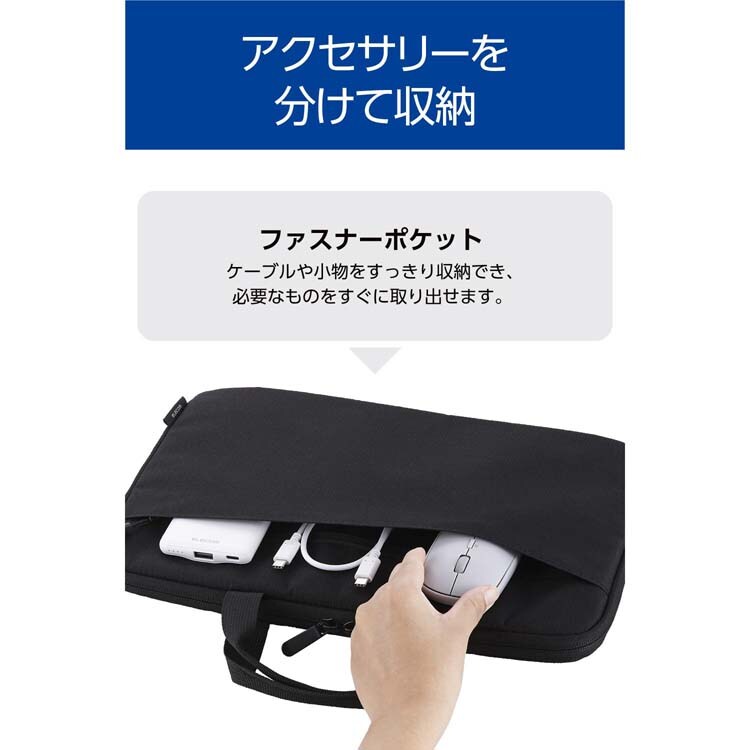●前面にはケーブルや小物をすっきり収納できるファスナーポケット付き。バッグの中がごちゃつかず、必要なものをすぐに取り出せます。