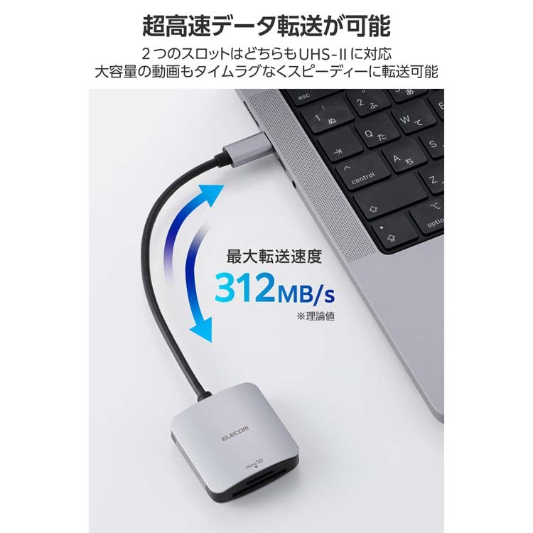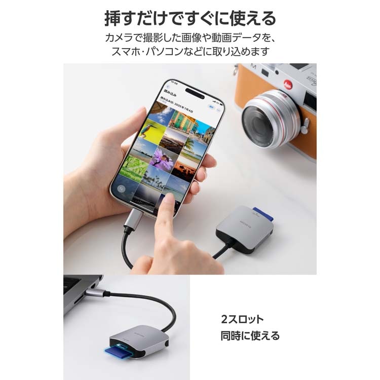 ●撮影データ転送がもっと速く快適になる、パソコンやスマホ、タブレットへの接続に便利なUSB Type-C(TM)プラグのケーブル付きメモリーカードリーダーです。