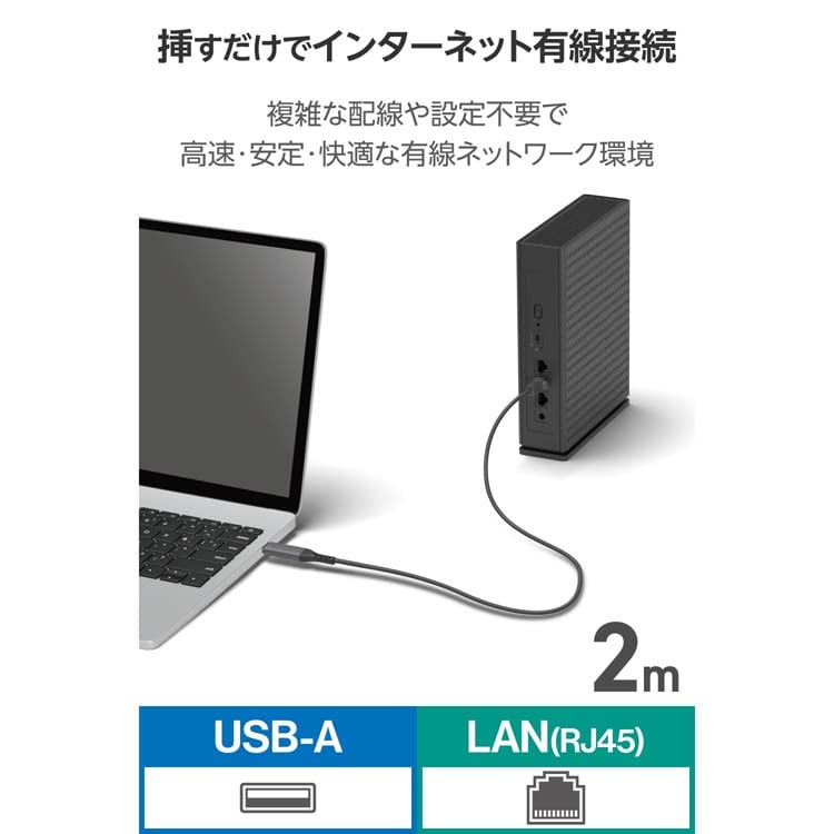 【エレコム USB-A有線LAN変換ケーブル 1Gbps ドライバ不要 ギガビット対応 2m ブラックの商品詳細】