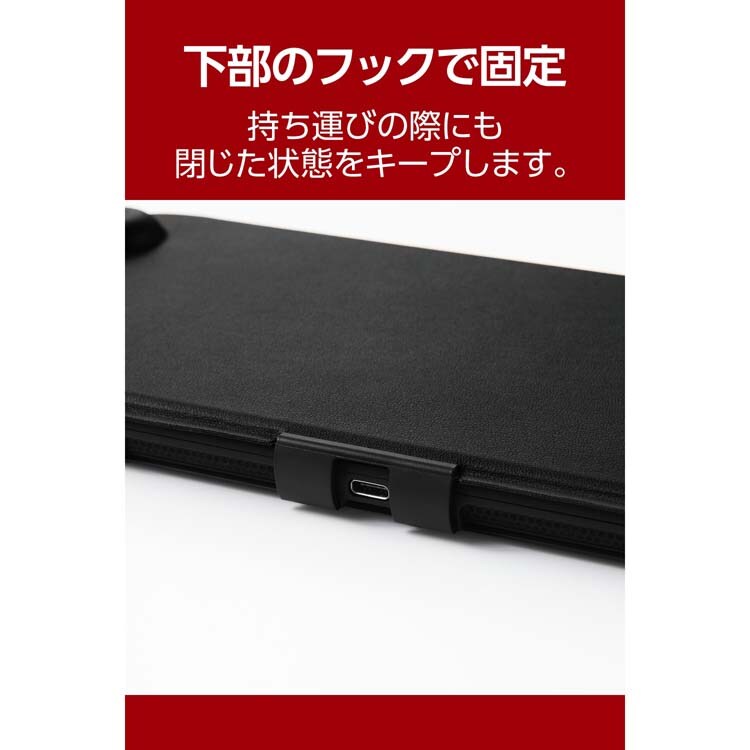 ●フックで機器本体に固定できるので、持ち運びの際もフラップは閉じたまま。画面への傷・ホコリの侵入を防ぎます。