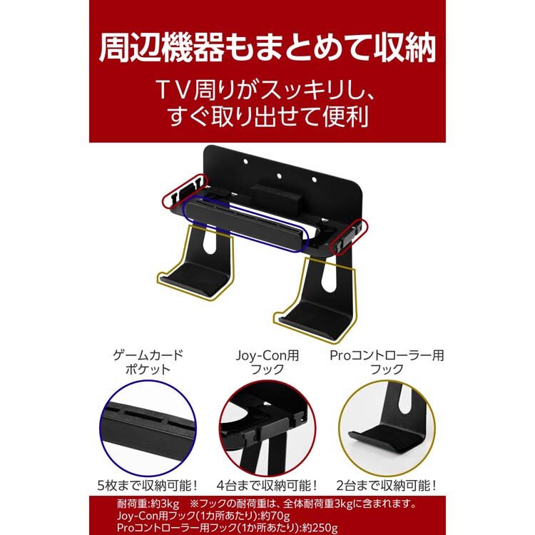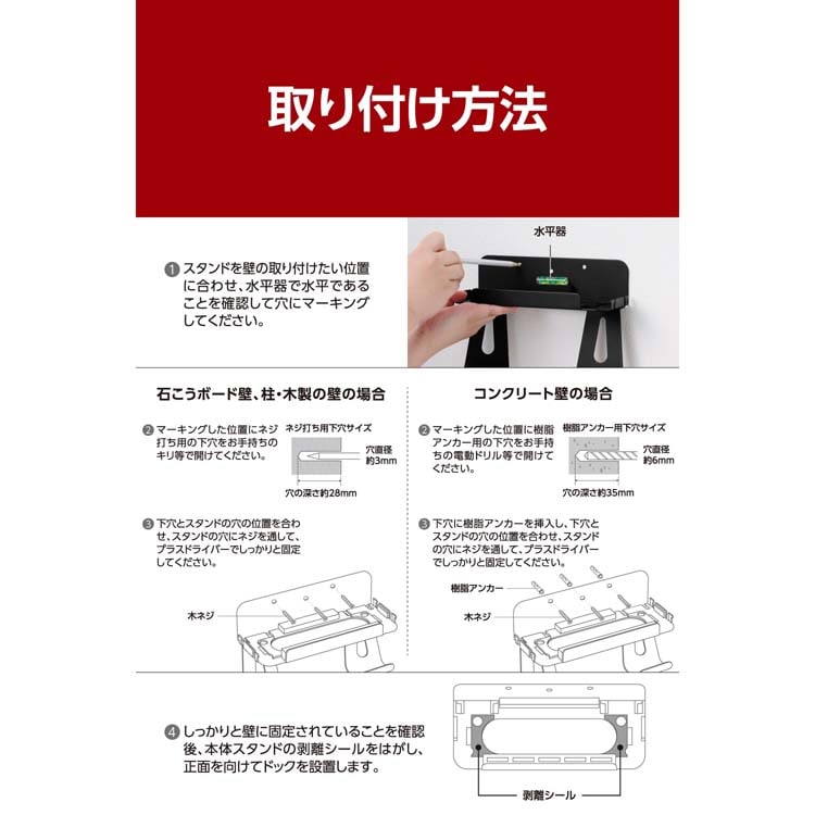 | ・対応機種:NINTENDO SWITCH(TM) 2、NINTENDOSWITCH(TM)(有機ELモデル)、NINTENDO SWITCH(TM) ・サイズ:本体スタンド:W約211mm×D約81mm×H約59mm、Proコントローラー用フック:W約65mm×D約81mm×H約100mm ・材質:スチール、EVA ・重量:480g ・耐荷重:約3kg、Joy-Con用フック(1カ所あたり):約70g、Proコントローラー用フック(1か所あたり):約250g ※フックの耐荷重は、全体耐荷重3kgに含まれます。 ・カラー:ブラック ・取り付け可能壁面:石こうボード壁(木製の間柱・胴縁にネジ固定できる場所)、柱・木製の壁(厚さ10mm以上)、コンクリート壁(厚さ150mm以上) |