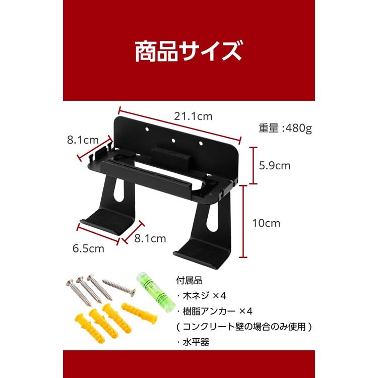 | 木ネジ×4、樹脂アンカー×4(コンクリート壁の場合のみ使用)、水平器 |