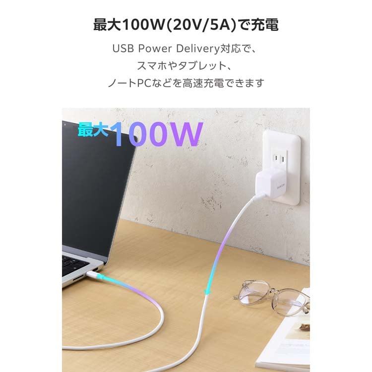 ●USB Power Deliveryに対応し、最大100W(20V/5A)で充電できます。スマートフォンやタブレット、パソコンなどの高速充電が可能です。
