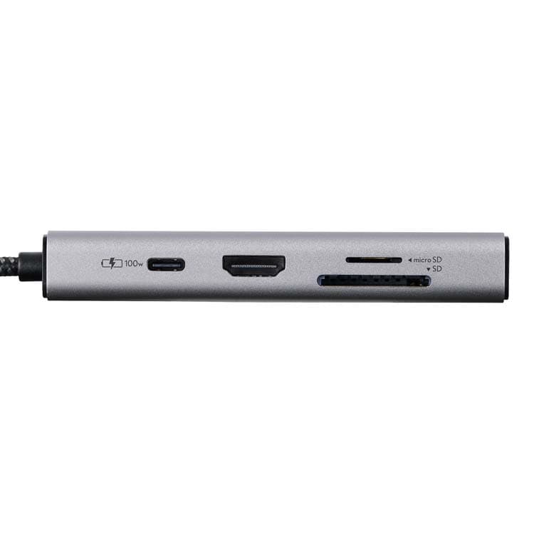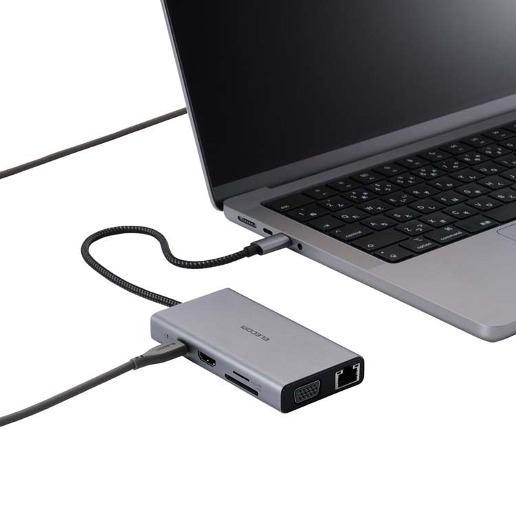| 対応OS(Windows):Windows 11/Windows 10 対応OS(macOS):macOS Sequoia15 対応OS(iPadOS):iPadOS 18 対応OS 備考:※各OSの最新バージョンへのアップデートや、サービスパックのインストールが必要になる場合があります。 コネクター仕様(アップストリーム):USB Type-C(TM)プラグ(USB 10Gbps(USB3.2(Gen2)))、USB Power Delivery対応(最大入力100W/最大出力90W)、DisplayPort(TM) Alternate Mode(USB2.0接続時は、USB2.0互換で動作(USB2.0接続時は、映像出力非対応)) USBポート(ダウンストリーム)(1):USB Type-Cポート×1 ※充電専用USB Power Deliveryポート USBポート(ダウンストリーム)(2):USB-Aポート(USB 5Gbps(USB3.2(Gen1)))×2 ※映像出力非対応 USBポート(ダウンストリーム)(3):USB-Aポート(USB 480Mbps(USB2.0))×1 映像出力ポート(ダウンストリーム)(1):HDMI×1(対応解像度:最大4K/30Hz) ※入力信号は標準のDisplayPort1.2に対応している必要があります。 映像出力ポート(ダウンストリーム)(2):VGA×1(対応解像度:最大1920×1080/60Hz) ※HDMIポートとVGAポート、同時接続の場合、両ポートの最大解像度は1920×1080/60Hzとなります。 LANポート(ダウンストリーム):RJ-45(1000BASE-T/100BASE-TX/10BASE-T) カードリーダー(ダウンストリーム)(1):SDカードスロット×1 ※SD/SDHC/SDXC カードリーダー(ダウンストリーム)(2):microSDカードスロット×1 ※microSD/microSDHC/microSDXC 音声ポート(ダウンストリーム):φ3.5mm4極ステレオミニジャック ケーブル長:約25cm ※プラグ含まず カラー:シルバー 外形寸法:幅約105mm×奥行約54mm×高さ約16mm ※ケーブル含まず 動作環境:温度5度~40度、湿度25%~75% ※結露なきこと 保証期間:1年間 |