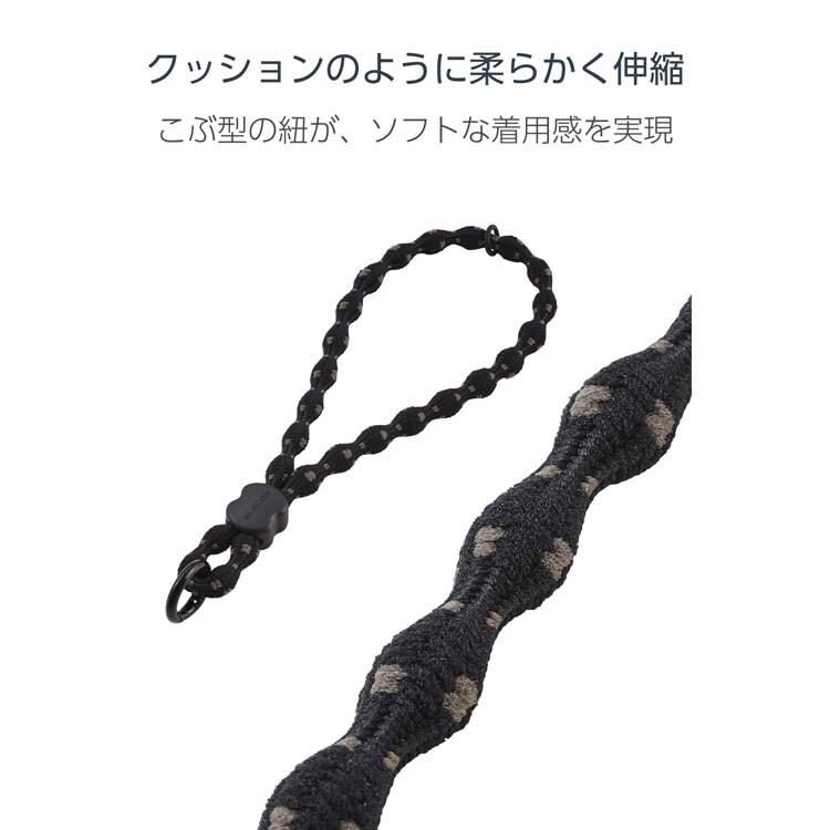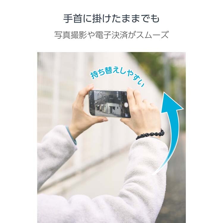 ●ひもは柔らかく伸縮し、手首に掛けたままでも写真撮影や電子決済をスムーズに行えます。
