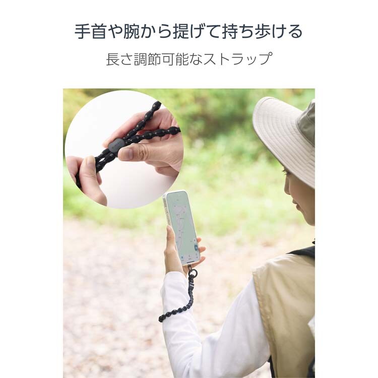 ●手首や腕から提げて持ち歩けるので、両手がふさがらずスマホ操作もスムーズ。落下、盗難、紛失防止にもなります。