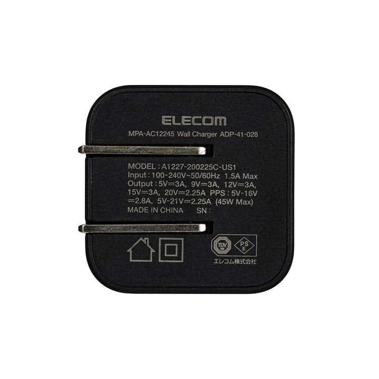 | ・対応機種:USB Type-C(TM)ポートからUSB Power Delivery (45W)およびオプション規格であるPPS(Programmable Power Supply)の規格内で充電可能な端末 ・定格入力電圧:AC100~240V、50/60Hz ・定格入力電流:1.5A ・定格出力電力:最大出力45W、PPS最大出力45W ・定格出力電圧:5V/9V/12V/15V/20V、PPS出力5V~16V/5V~21V ・定格出力電流:5V時3A/9V時3A/12V時3A/15V時3A/20V時2.25A、PPS出力5V~16V時2.8A、5V~21V時2.25A ・外形寸法:幅約41.5mm×奥行約34.6mm×高さ約34.6mm ・重量:約68g ・カラー:ブラック ・使用可能地域:日本 ・保証期間:1年間 ・コネクター形状:USB Type-Cポート×1 ・コンセントプラグ仕様:90度スイング構造 ・使用温度範囲:0度~25度 ・法令:ひし形PSE 特定電気用品 |
