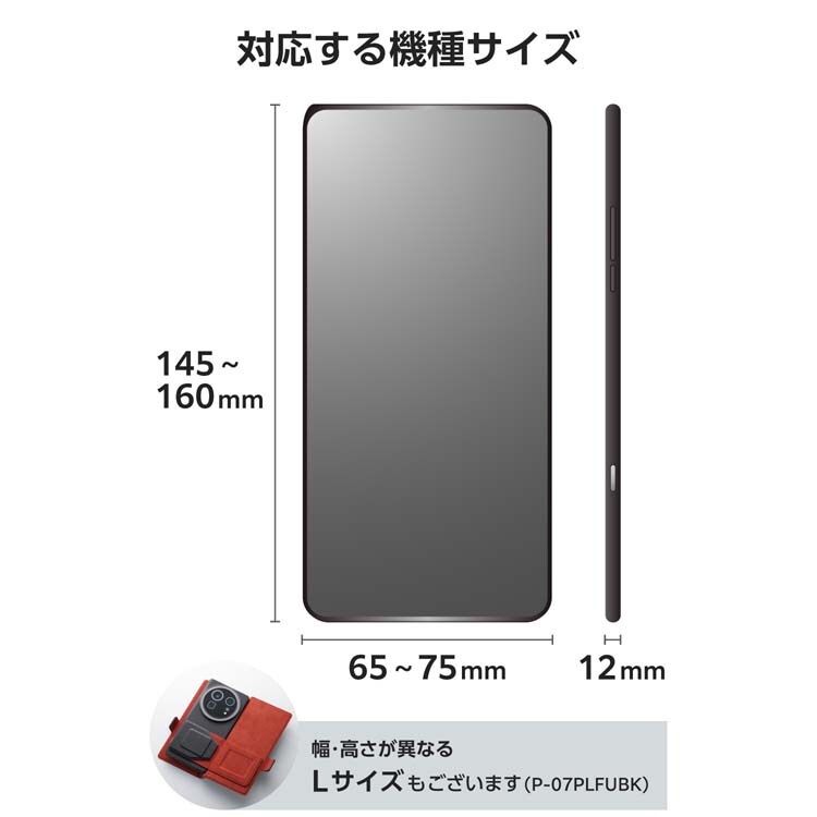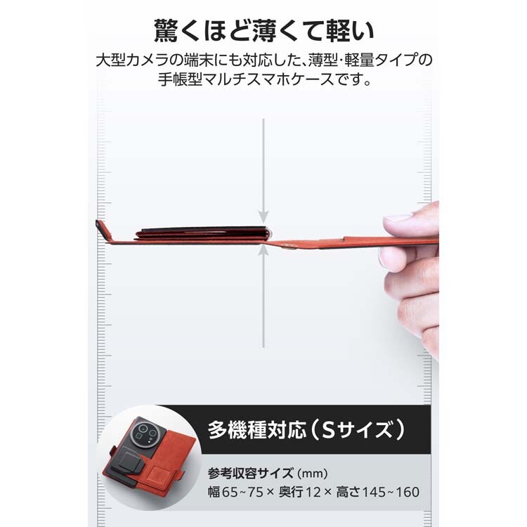 ●大型カメラの端末にも対応した、本体の薄さや軽さを損なわない、薄型・軽量タイプの手帳型マルチスマホケース(Sサイズ)です。