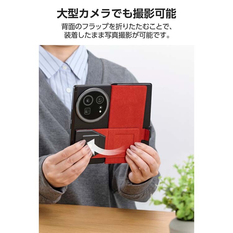 ●背面のフラップを折りたたむことで、装着したまま写真撮影が可能です。