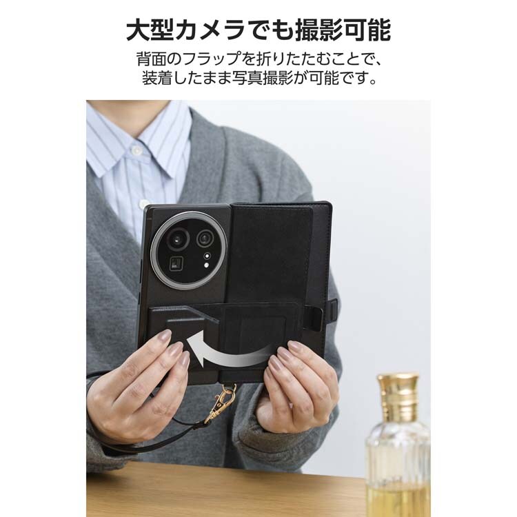 ●背面のフラップを折りたたむことで、装着したまま写真撮影が可能です。