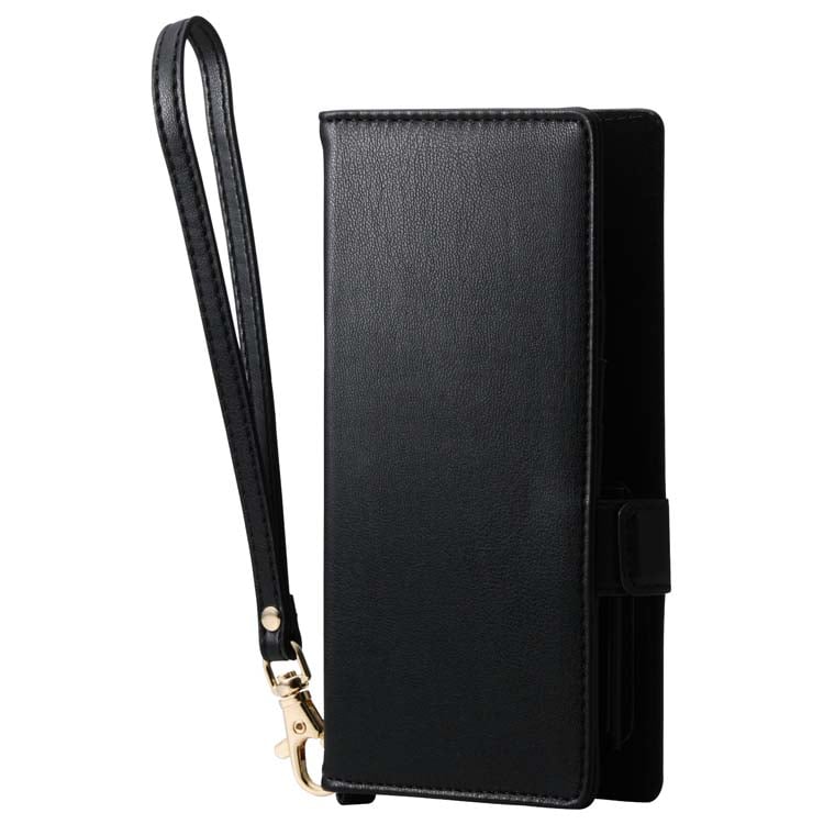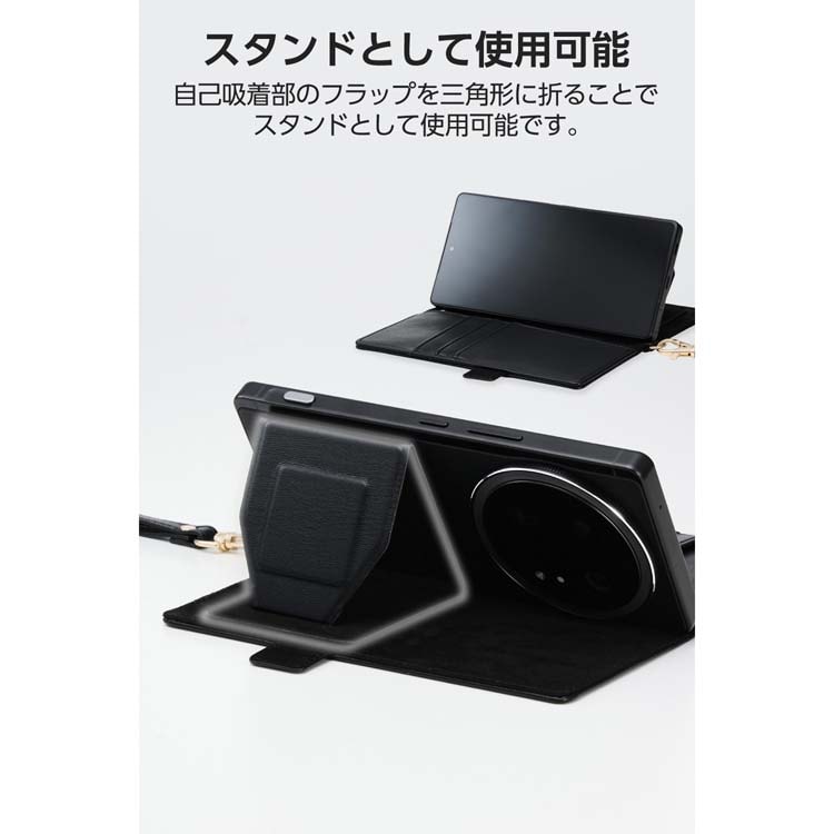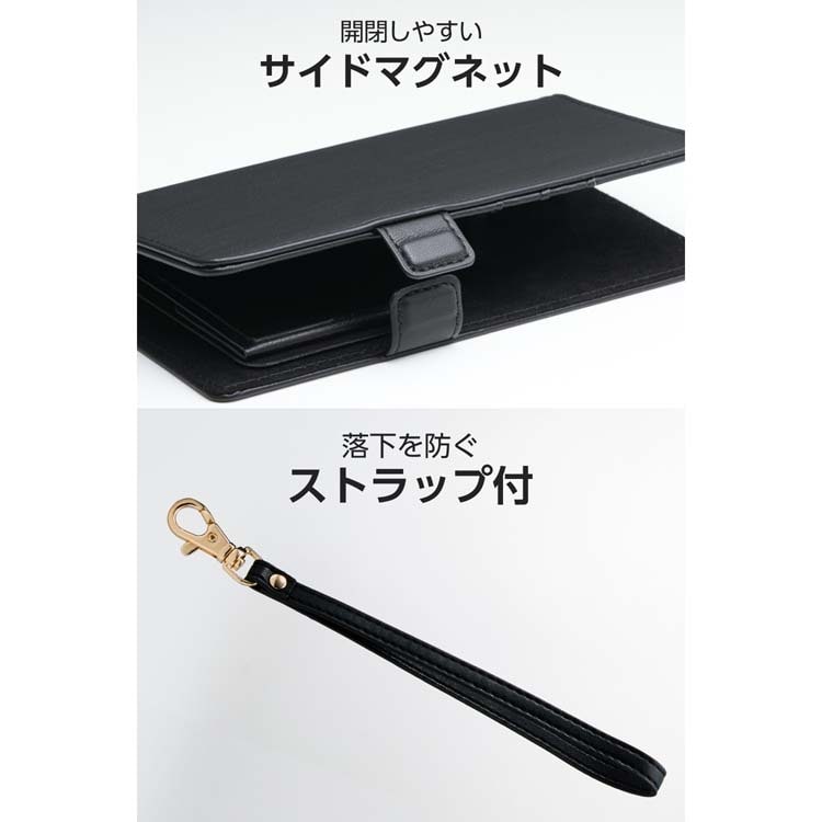●大型カメラの端末にも対応し、4つのカードポケットとハンドストラップが付属した手帳型マルチスマホケース(Sサイズ)です。