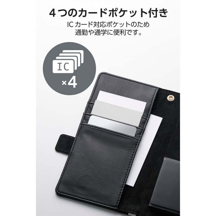●フラップの内側には、メモやカードなどを収納できる4つのポケット付き。カードを出し入れすることなく、そのままICカードを使用できます。