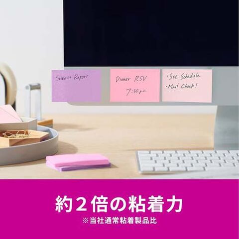 ●強粘着タイプのポスト・イット(R)ノートです。パソコンのデスクトップやキャビネット、樹脂製品などつきにくかった場所にしっかり貼れます。