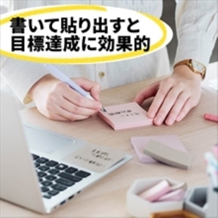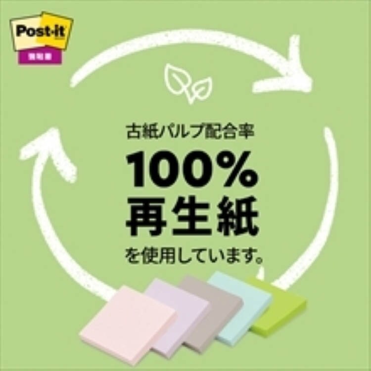 ●垂直面にもしっかり貼れる粘着力約2倍の強粘着タイプ(ポストイット通常粘着製品比)。淡いカラーなので、書いた文字が読みやすい。エコマーク対応、古紙パルプ配合の再生紙です