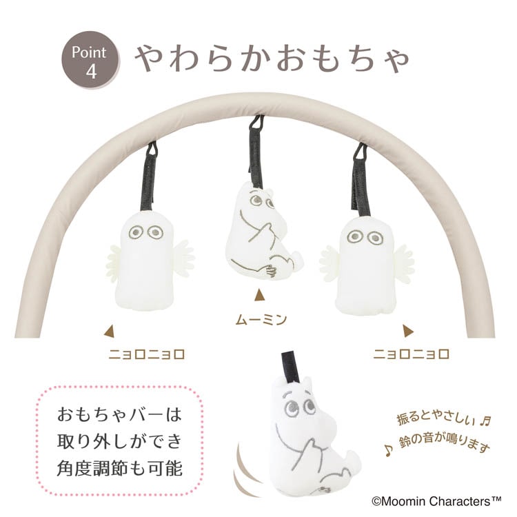 ●おもちゃバーには柔らかなムーミン、ニョロニョロのおもちゃが付いています。