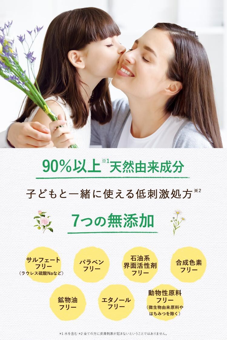 サルフェートフリー(*9)・パラベンフリー・合成色素フリー・鉱物油フリー・石油系界面活性剤フリー・エタノールフリー