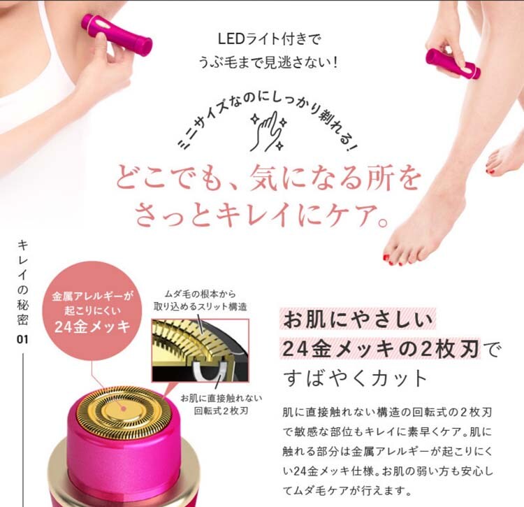 ●ムダ毛カッターの肌に触れる部分は金属アレルギーが起こりくい24金メッキ。