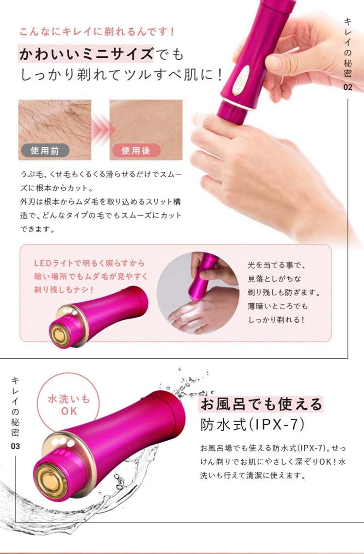 ●お風呂でも使える防水式(IPX7)。石鹸ぞりで肌にやさしく深ぞりOK!水洗いも行えて清潔に使えます。