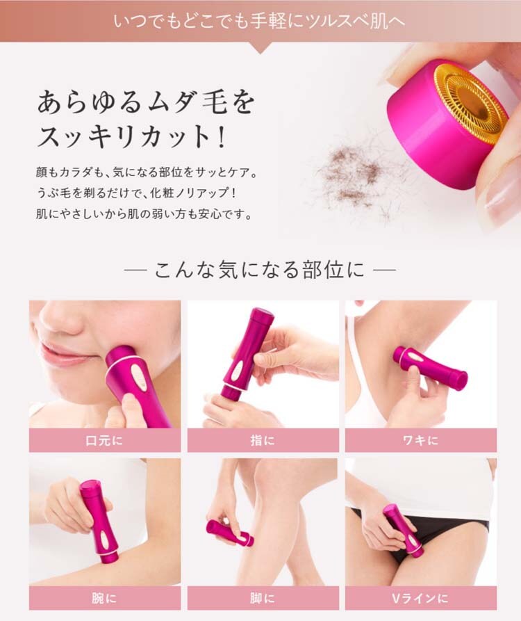●ムダ毛カッター、鼻毛カッターは回転式の2枚刃で剃り残しも少なく、剃れにくいうぶ毛やくせ毛も軽く滑らすだけでスムーズにカット!お手入れの時短にもなりスピーディー!