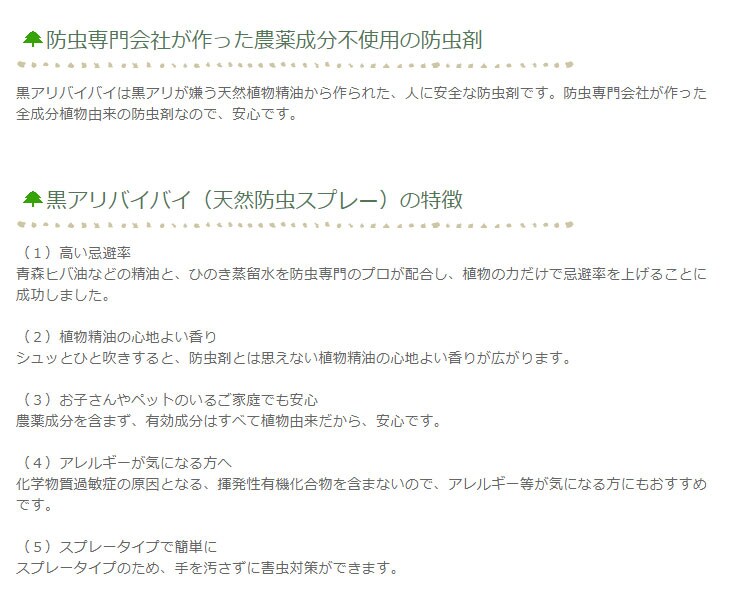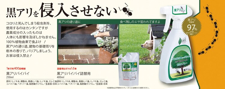 ●お部屋に入りこむ黒アリを防ぎます。住宅内で黒アリが出入りしているスキマや通り道・建物の基礎周りに定期的にスプレーしてください。青森ひば油や植物成分を配合、天然成分で人や住まい、環境を守ります。