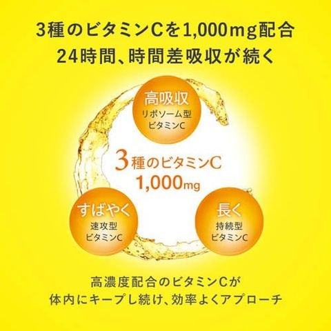 ●リポソーム型ビタミンCをはじめ、吸収・持続力に優れた3種のビタミンCを1000mg高濃度配合。時間差で働き、24時間吸収が続きます。