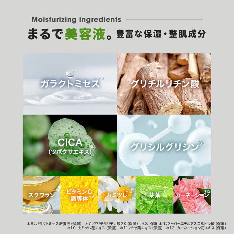 | 水、カオリン、BG、タナクラクレイ、ペンチレングリコール、セルロースガム、イライト、海シルト、ガラクトミセス培養液、グリチルリチン酸2K、グリシルグリシン、スクワラン、ツボクサエキス、3-0-エチルアスコルビン酸、イタドリ根エキス、オウゴン根エキス、カンゾウ根エキス、チャ葉エキス、ヒアルロン酸Na、カミツレ花エキス、ローズマリー葉エキス、カーネーション花 エキス、フィトステロールズ、セラミドNG、セラミドAP、セラミドAG、セラミドNP、セラミドEOP、ポリ-ε-リシン、クエン酸、1、2-ヘキサンジオール、水添レシチン、香料 |