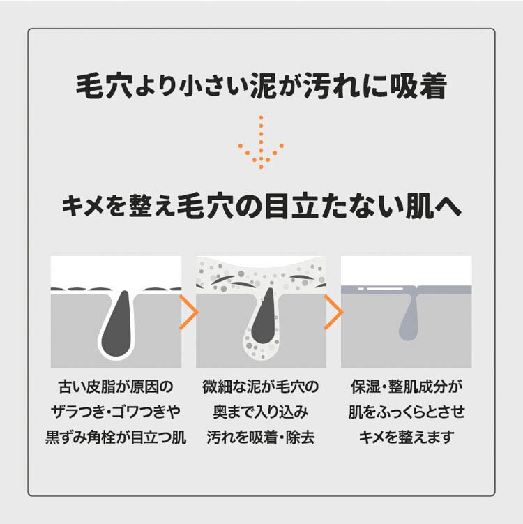 ●毛穴サイズの数十分の1といわれる数種類の泥が肌の汚れを吸着し、蓄える水分量を整えます