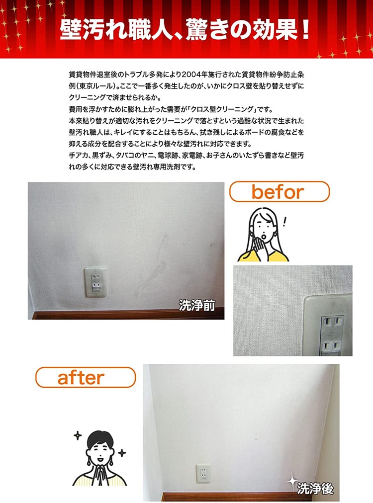 ●壁汚れ職人は、様々なクロス壁の汚れを最も落とし易く配合。今までの壁用洗剤よりも優れた洗浄力を発揮します。
