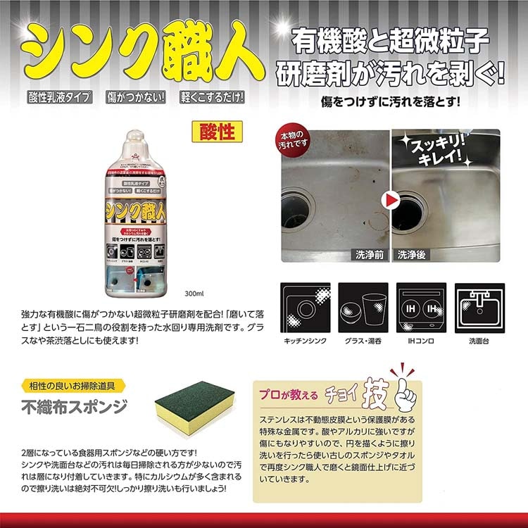 | ・液性:酸性 ・用途:キッチンシンク、洗面台の水アカ除去、グラスや陶器のくすみや茶しぶ除去、金属の磨き作業に |