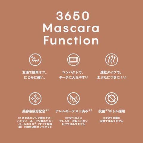 ●3650マスカラリムーバまたはお湯をなじませ、洗顔料やクレンジング料でオフ。