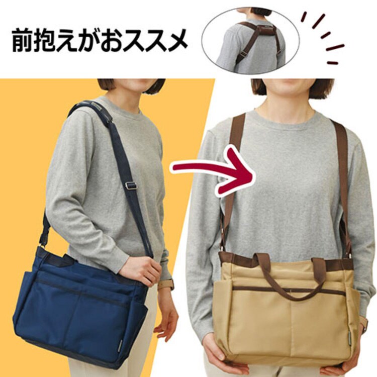 ●1本で5通りの掛け方にカンタンに変身して楽ちんになります。中でもA4サイズで広く使いやすいサイズで軽量。ポケットも使いやすく、付け替え方式のためベルトを他のバッグにも使えます。