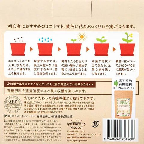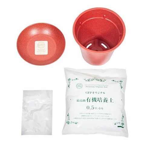 材質・・・有機種子 ミニトマト、有機培養土(鹿沼土、赤玉土、パーライト、バーミキュライト、くん炭、ゼオライト、バッドグアノ、腐葉土、植物性有機堆肥、ピートモス、ココピート ※素材の一部に海外産があり、国内で調合)、ポット・ソーサー(80%は米のもみ殻、残りの20%は天然素材系合成レジンで石油不使用の生分解性素材)