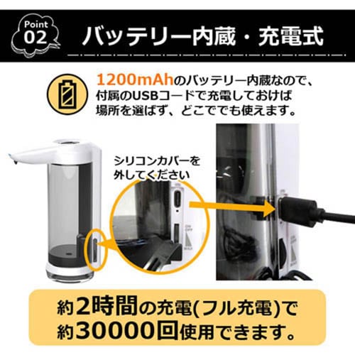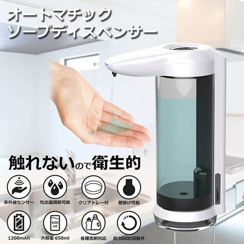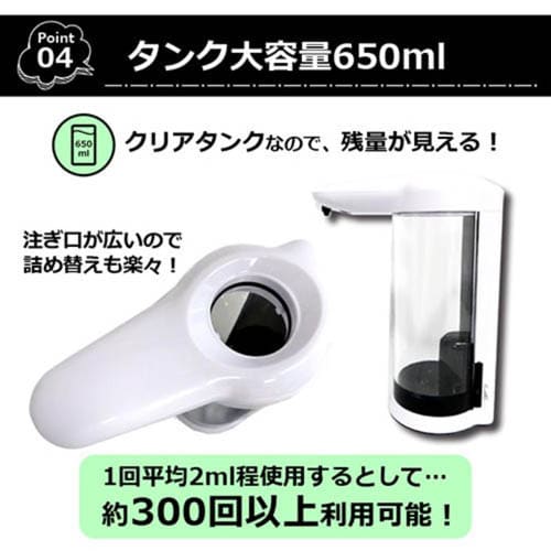 | ・サイズ:約165×93×225mm ・重量:約495g ・材質:ABS、PC ・タンク容量:650ml ・センサー範囲:約8cm ・液体調節量:1-5ml ・電池の種類:リチウムイオン充電池 ・バッテリー容量:1200mAh ・充電時間:約2時間 ・使用回数:フル充電で約30000回 ・付属品:USB充電ケーブル、取扱説明書 ・保証期間:6か月 ・生産国:中国 ・パッケージサイズ:95×230×170mm ・パッケージ重量:600g |