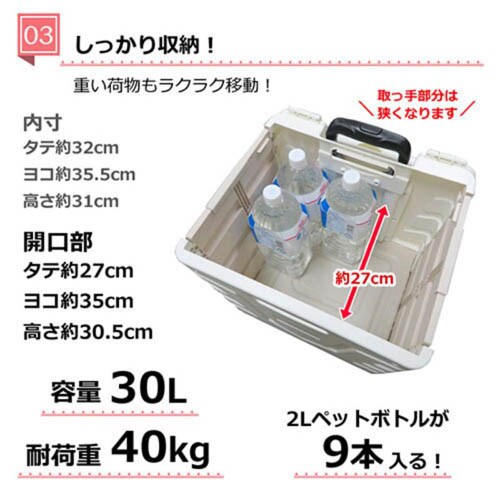 ●容量30L、耐荷重40kg、2Lのペットボトルが9本入ります!